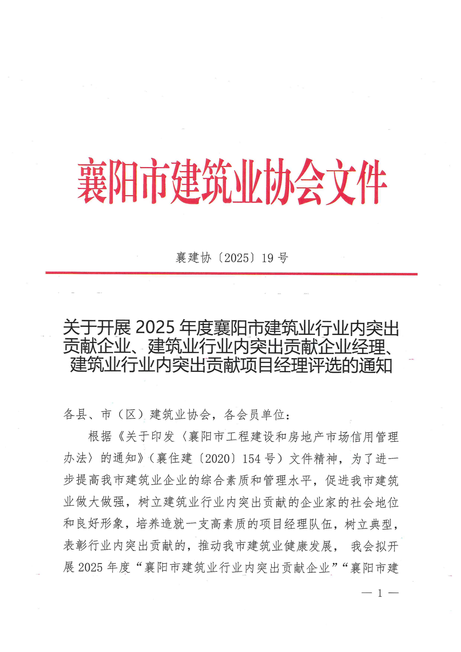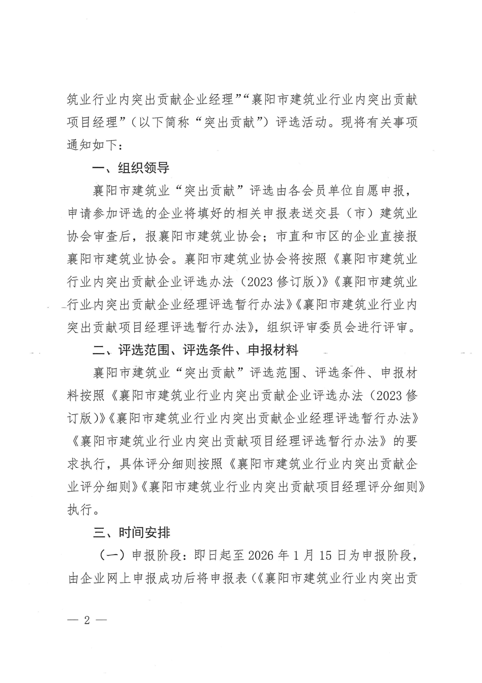 关于开展 2025 年度襄阳市建筑业行业内突出贡献企业、建筑业行业内突出贡献企业经理建筑业行业内突出贡献项目经理评选的通知