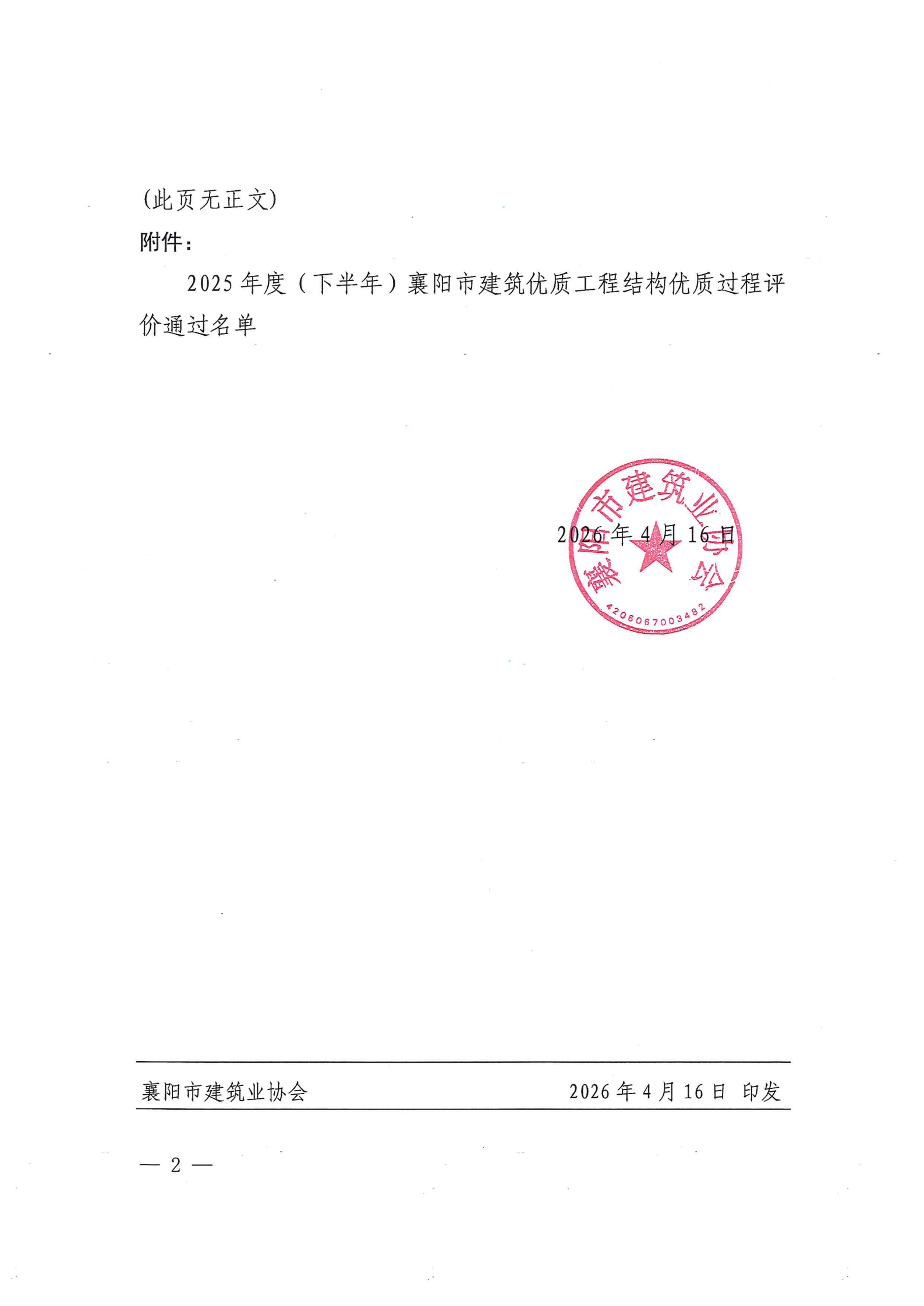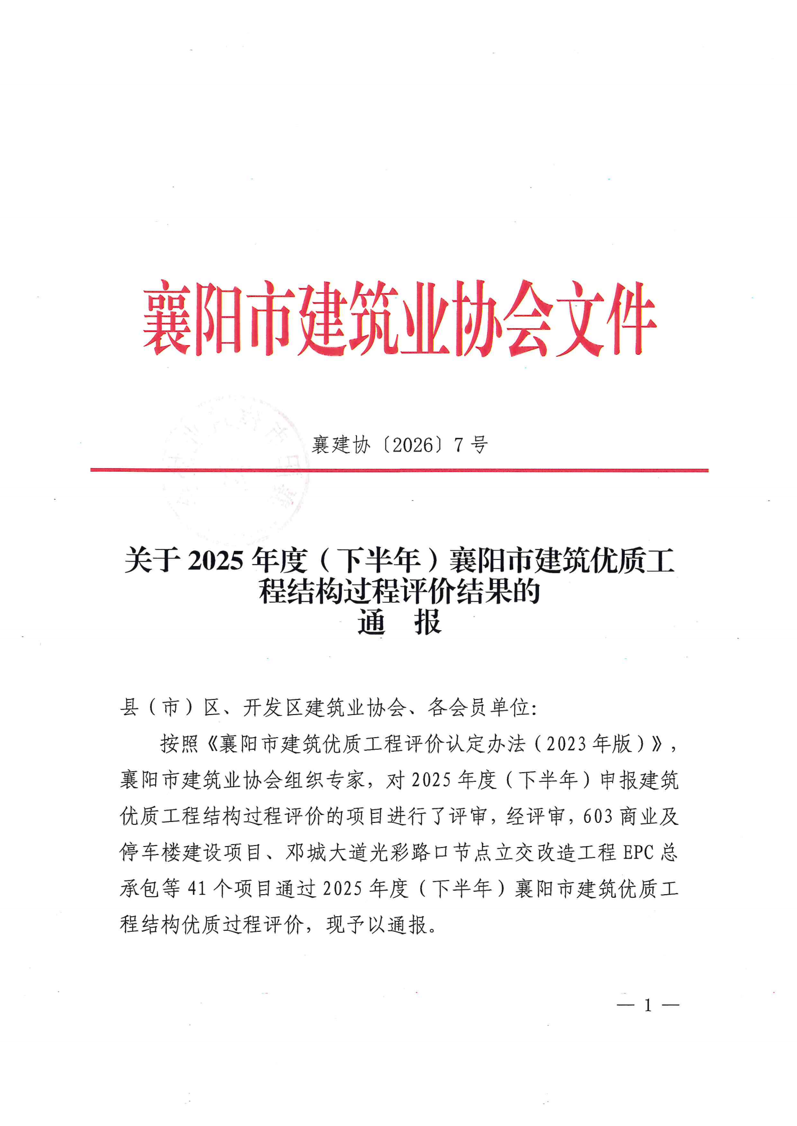 关于2025年度(下半年)襄阳市建筑优质工程结构过程评价结果的通报