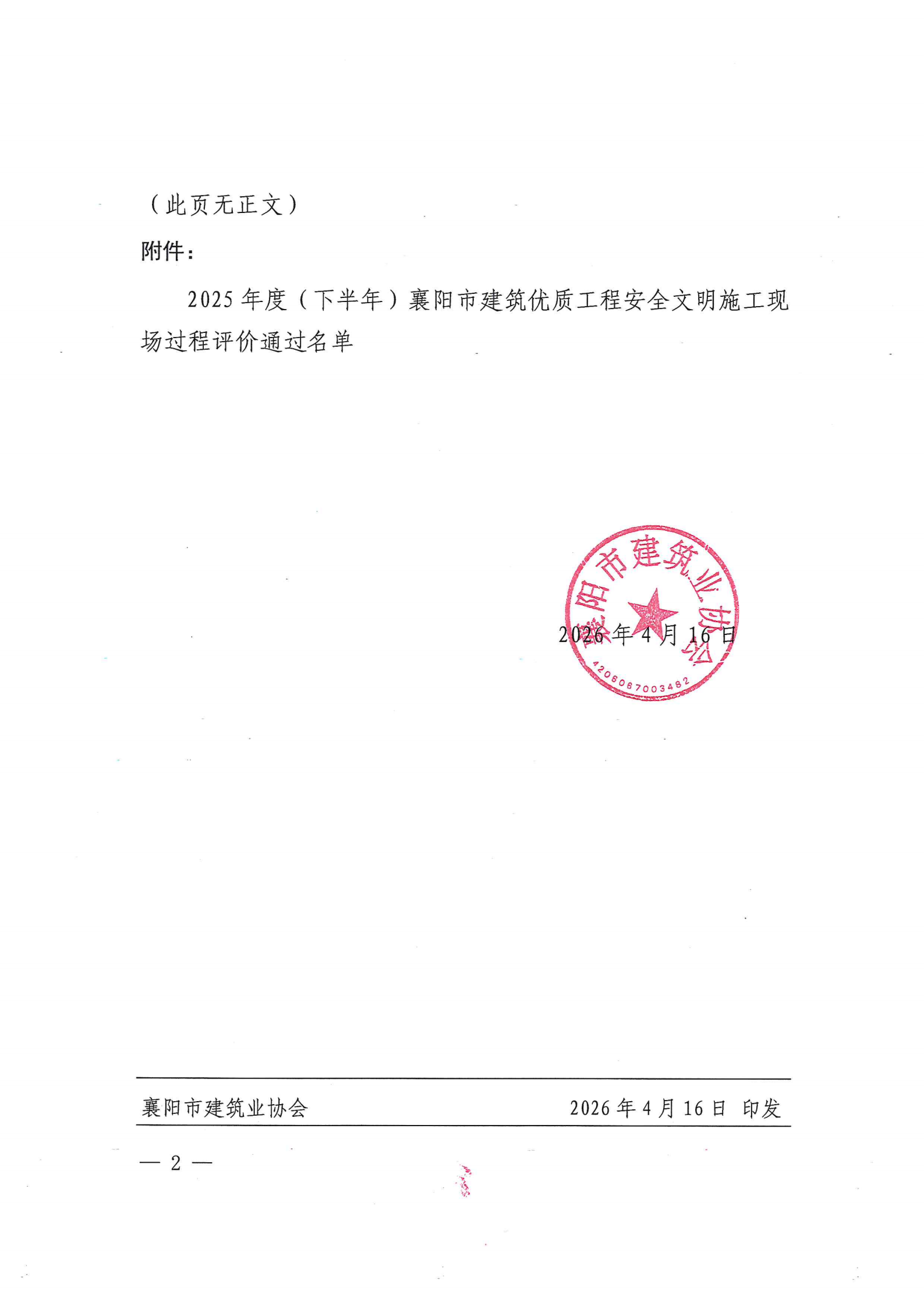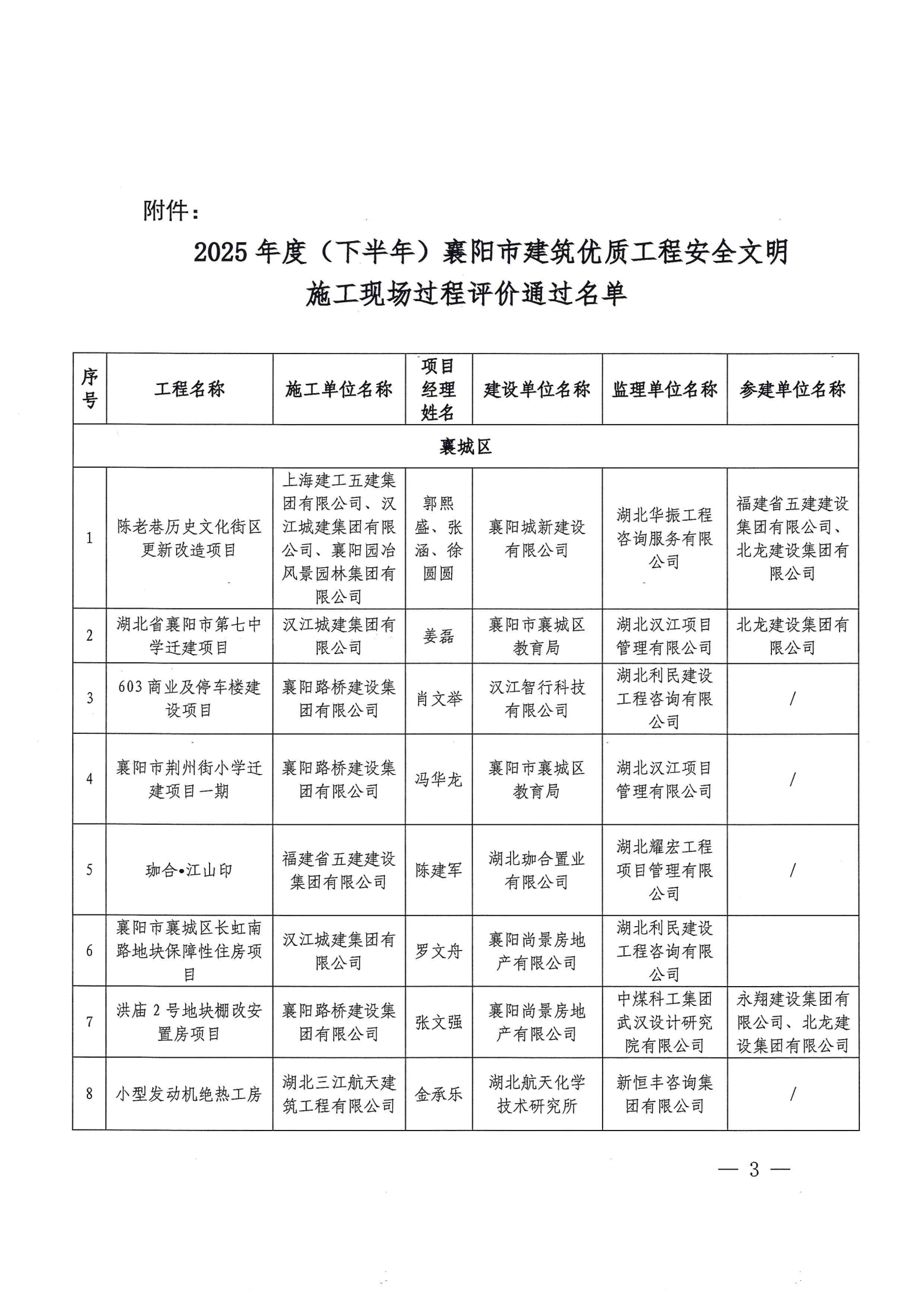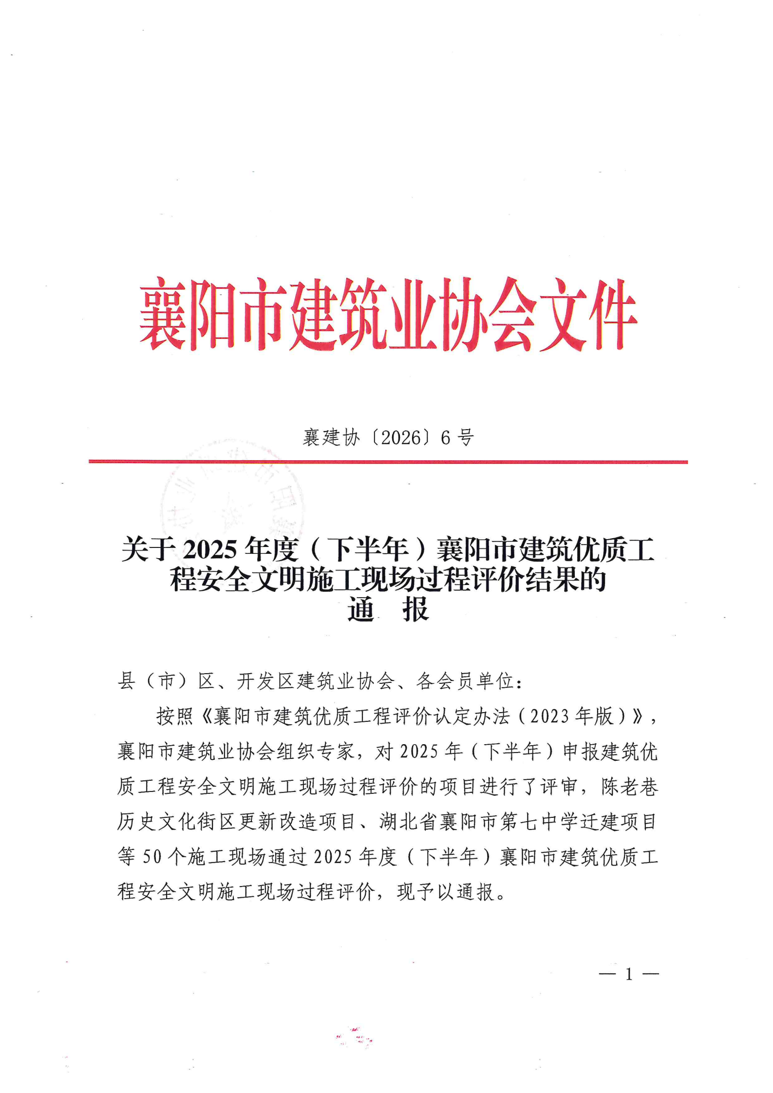 关于2025年度(下半年)襄阳市建筑优质工程安全文明施工现场过程评价结果的通报